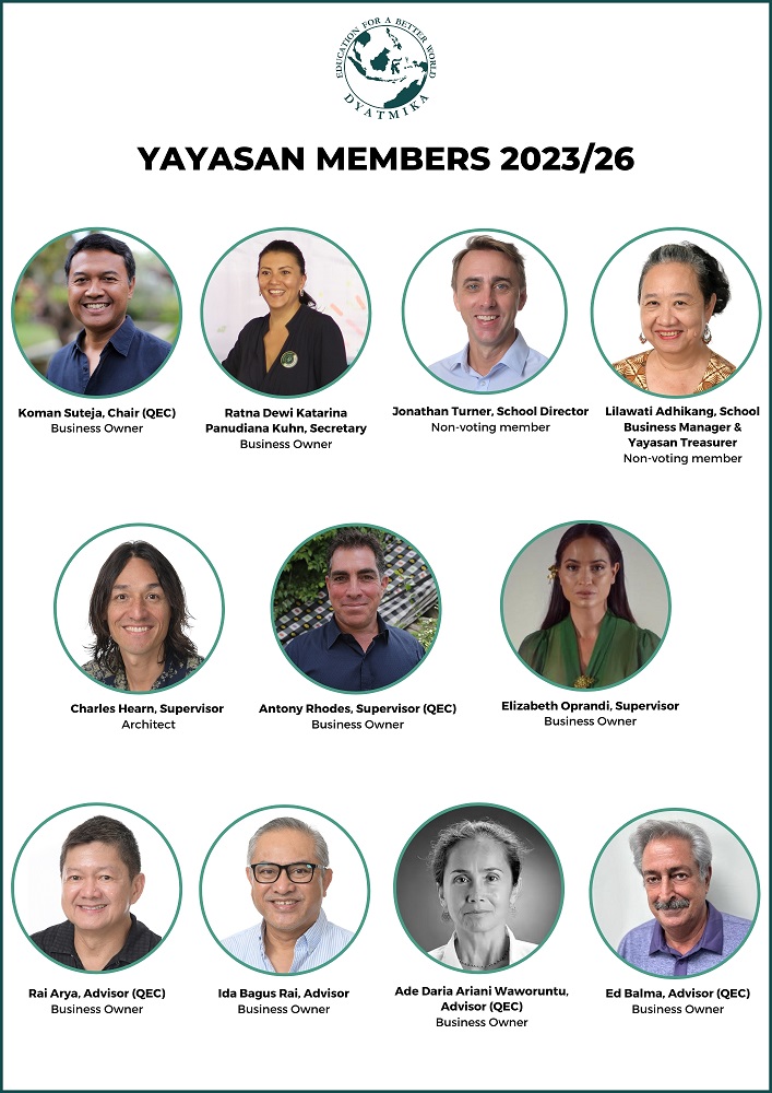 The Yayasan is made up of non-paid volunteers who bring a range of professional business expertise and skills to the school. They share a deep commitment to the school and are united in their experience as current or past parents of students at Dyatmika.